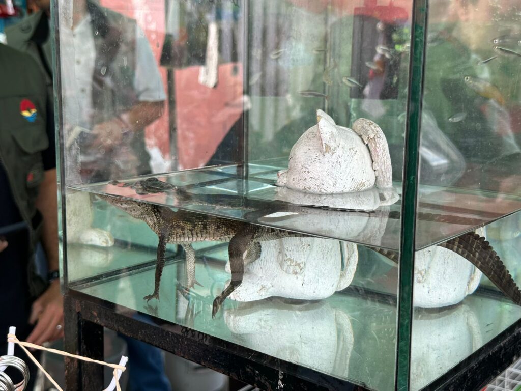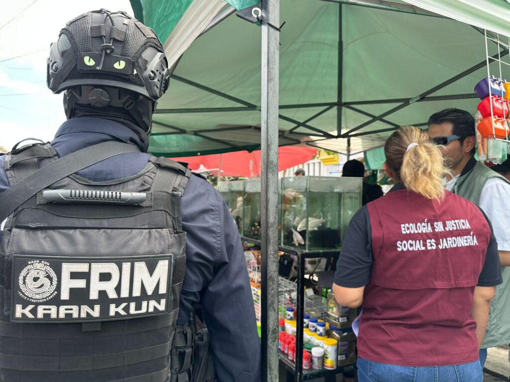Como parte de los operativos que llevan a cabo elementos de la Guardia Nacional y Secretaría de Marina cada domingo en el tianguis de la Región 100 en Cancún y con la ayuda de ciudadanos que evidenciaron la presencia de especies exóticas para su venta se logró asegurar la cría de cocodrilo al interior de una pecera.