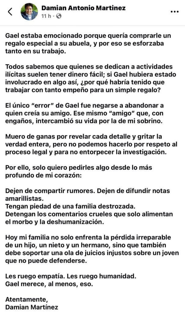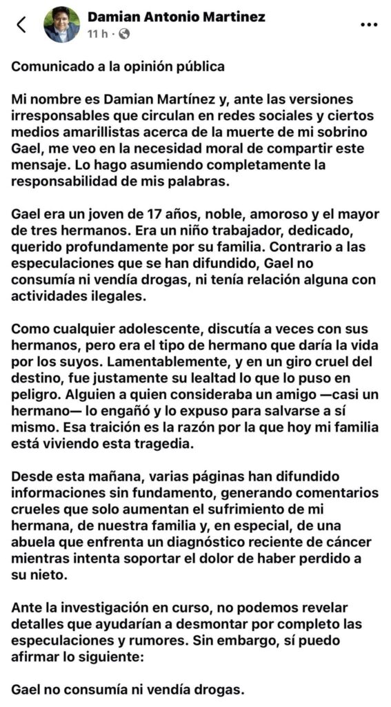 Señaló también que Gael habría sido engañado por alguien a quien él consideraba casi un hermano, un supuesto amigo que “intercambió su vida por la de mi sobrino para salvarse a sí mismo”. Una traición que de acuerdo a la familia, selló el destino del adolescente.