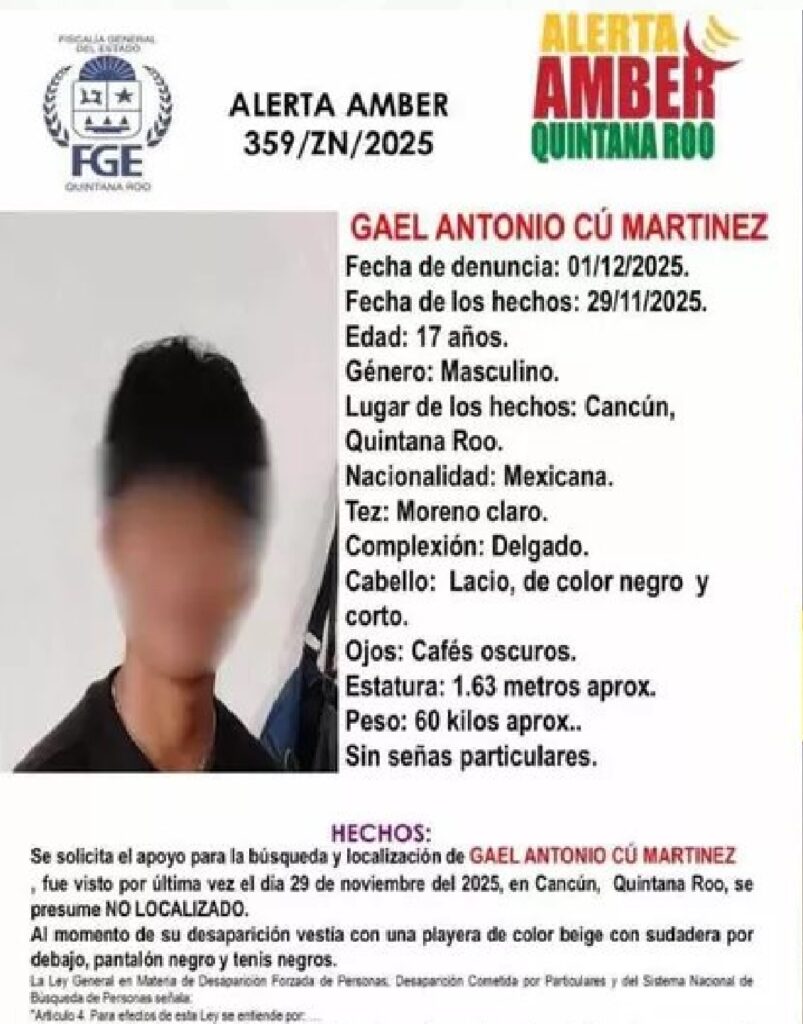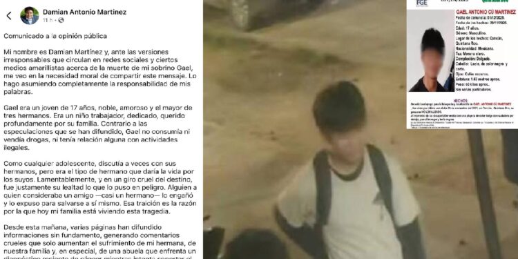 La familia del joven Gael Antonio Cú Martínez de 17 años que fue hallado sin vida el pasado lunes 1 de diciembre por transeúntes en la Región 260 luego de haber sido reportado como desaparecido desde el pasado 29 de noviembre cuando se le perdió la pista luego de salir de su trabajo en Cancún, rompe el silencio y desmiente las versiones que circulan en redes sociales y las califican de “amarillistas, crueles y completamente falsas”.