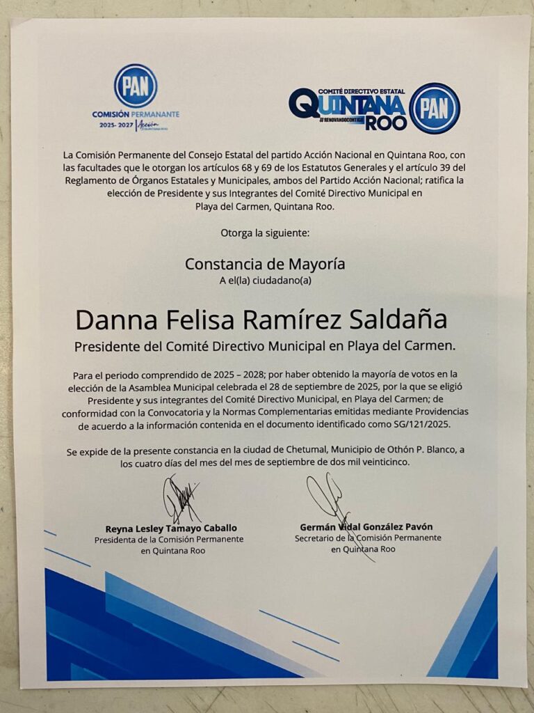 El Partido Acción Nacional (PAN) en Playa del Carmen ratificó este fin de semana a Danna Ramírez Saldaña como dirigente municipal, en el marco de la sesión de la Comisión Permanente Estatal celebrada en esta ciudad, donde además se tomó protesta a los nuevos comités directivos municipales de Quintana Roo.