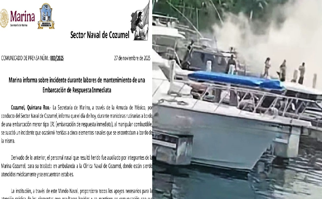 La Armada de México confirmó el incidente ocurrido este jueves durante labores de mantenimiento a bordo de una embarcación menor tipo ERI (Embarcación de Respuesta Inmediata), dentro de las instalaciones de la Marina de Cozumel.