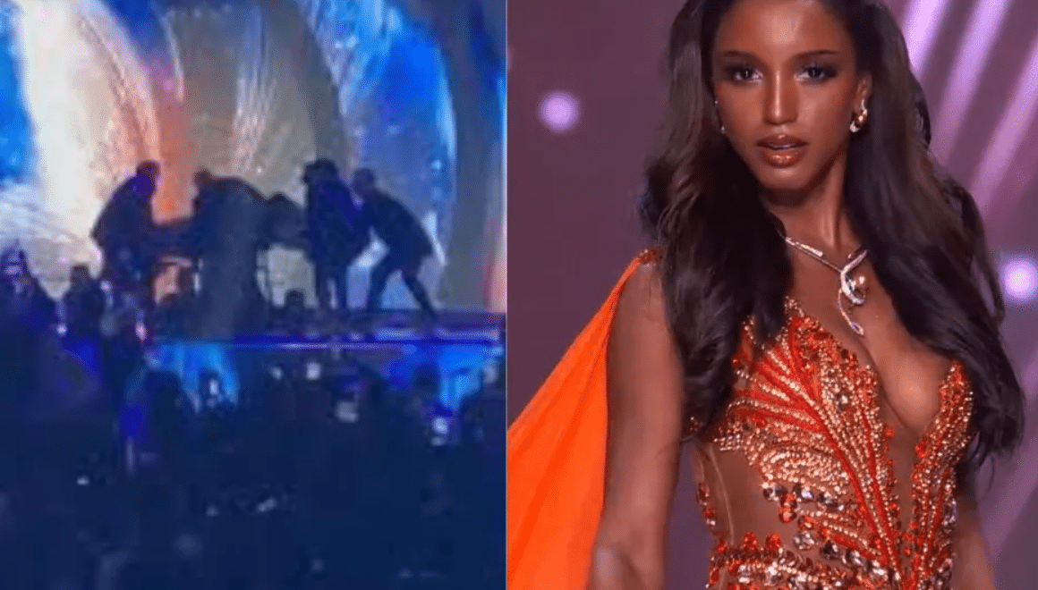 El momento que desató la preocupación internacional ocurrió cuando Gabrielle Henry, luciendo un vestido naranja, perdió el equilibrio y cayó desde el borde del escenario ante cientos de personas. El público reaccionó con gritos y desconcierto mientras el equipo de producción asistía a la concursante. Imágenes difundidas en redes mostraron su salida en camilla, aumentando la alarma global.