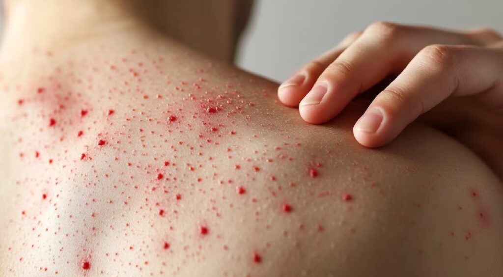 - Lo distintivo llega después: las manchas de Koplik, que son puntos blancos dentro de tu boca. Estas son la antesala del sarpullido rojo que desciende desde tu cabeza hasta cubrir todo el cuerpo de manera uniforme.