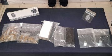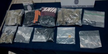 En otro hecho en la ciudad, esta vez sobre la avenida Azulejos entre calles Sur y Rayadores del fraccionamiento Villas del Sol, fueron asegurados Edgar “N” de 42 años, procedente de Yucatán, en posesión de una réplica de arma de fuego, Eliud “N” de 18 años, originario de la misma entidad y José “N” de 22 años de edad oriundo de Chiapas, así como 28 envoltorios con marihuana, 11 con posible cristal, uno con cocaína y uno con una sustancia a determinar, esto luego de ser sorprendidos en un recorrido intercambiando posibles drogas e intentar huir.