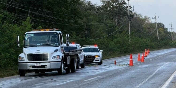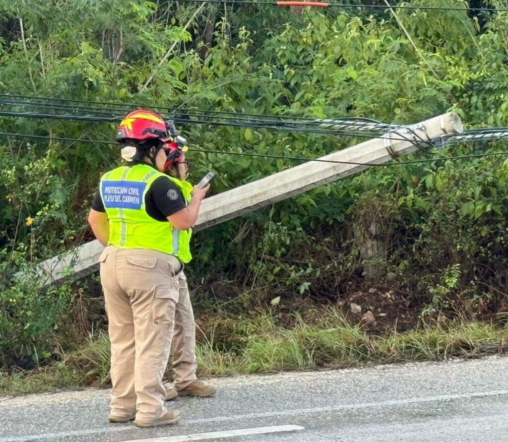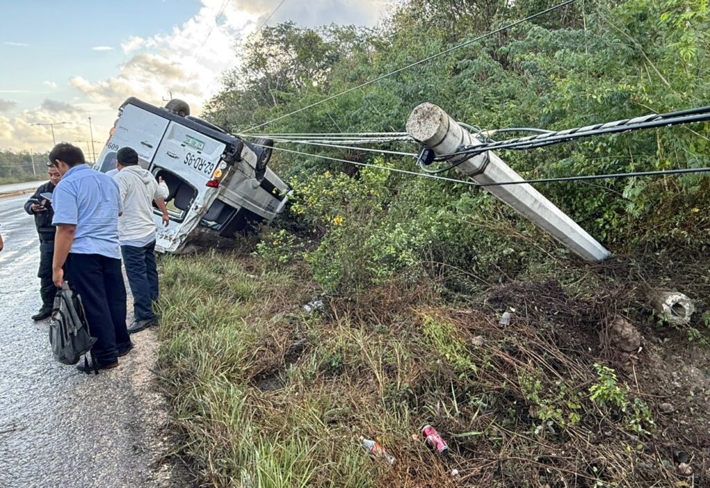 Conductor de camioneta de turismo se vuelca y derriba poste de CFE en tramo Tulum-Playa del Carmen