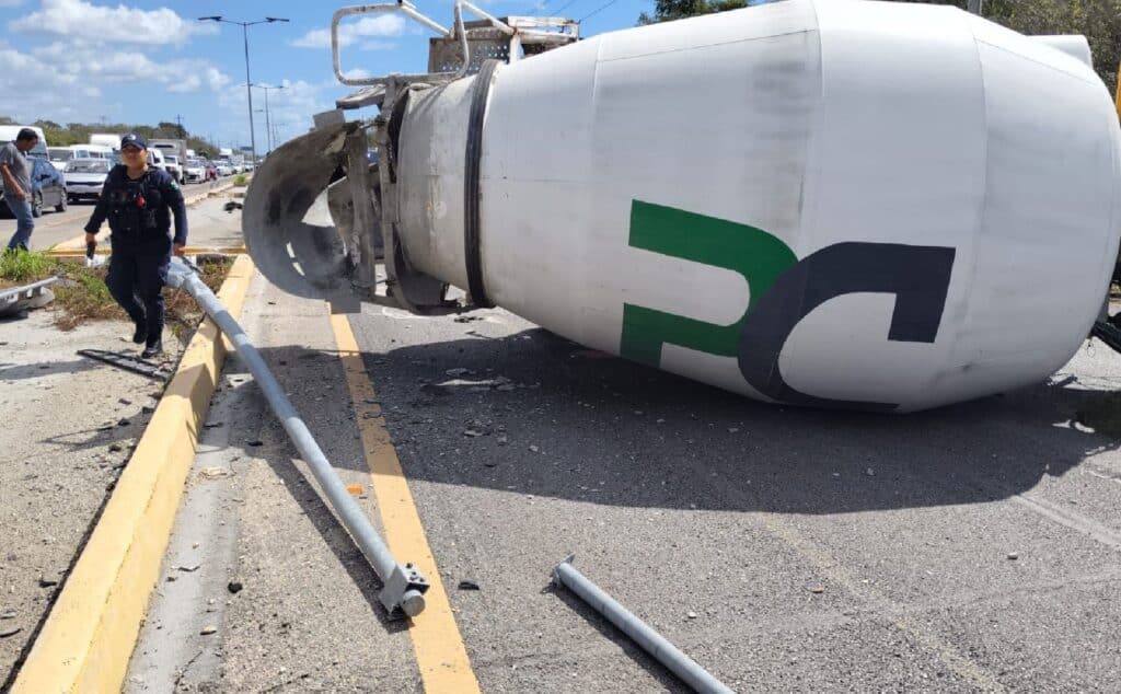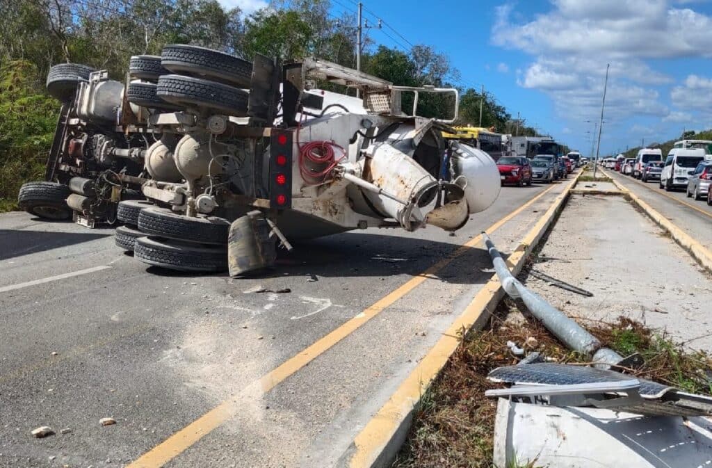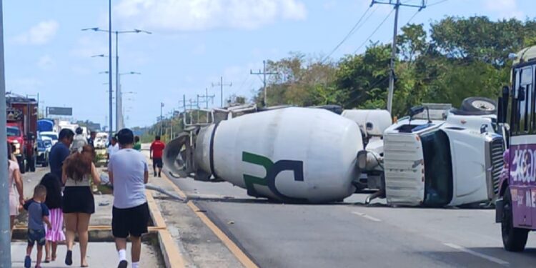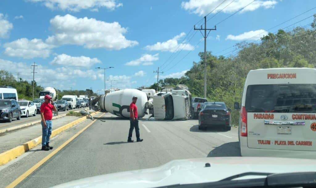 El reporte de la volcadura de un camión revolvedora de cemento sobre la carretera federal 307 en el tramo Playa del Carmen-Tulum provocó una fuerte movilización de los cuerpos de emergencia y de las autoridades policiacas tras afectar la circulación de la zona.
