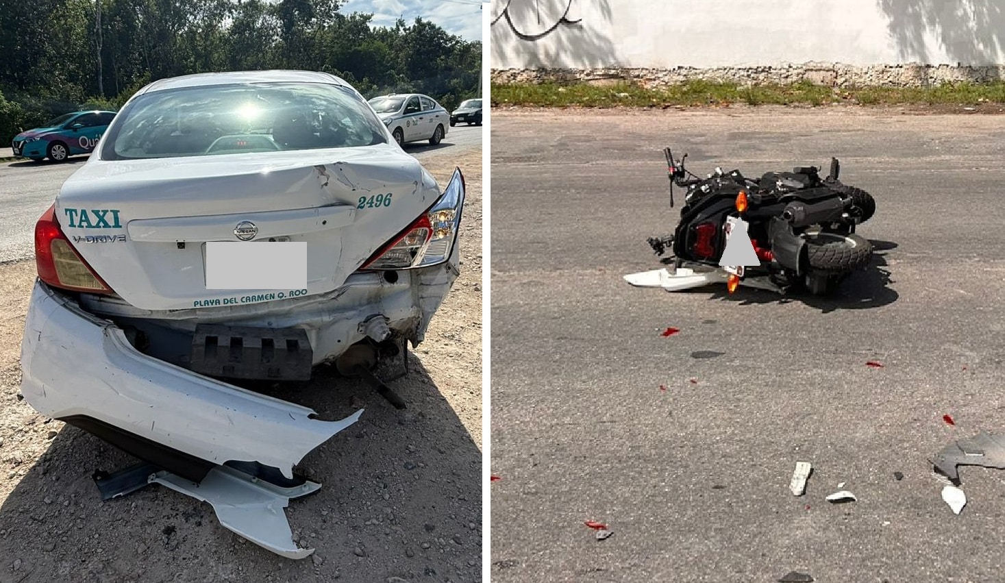 Grave accidente vehicular se registró la tarde de ayer sobre el cruce del Boulevard Luis Donaldo Colosio con la avenida Flor de Ciruelo que dejó como saldo a un joven motociclista con lesiones de gravedad, luego de colisionar por alcance contra un taxista de Playa del Carmen.