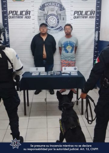 Asimismo, en un recorrido de la Policía Turística y la Unidad Canina en la Quinta Avenida entre calles 10 y 12, fueron asegurados dos sujetos cuando el elemento canino detectó una sustancias ilícitas. por lo que al seguir el rastro los condujo hasta dos personas que al notar la presencia policiaca, trataron de darse a la fuga, pero accedieron luego de los comandos verbales de la policía.