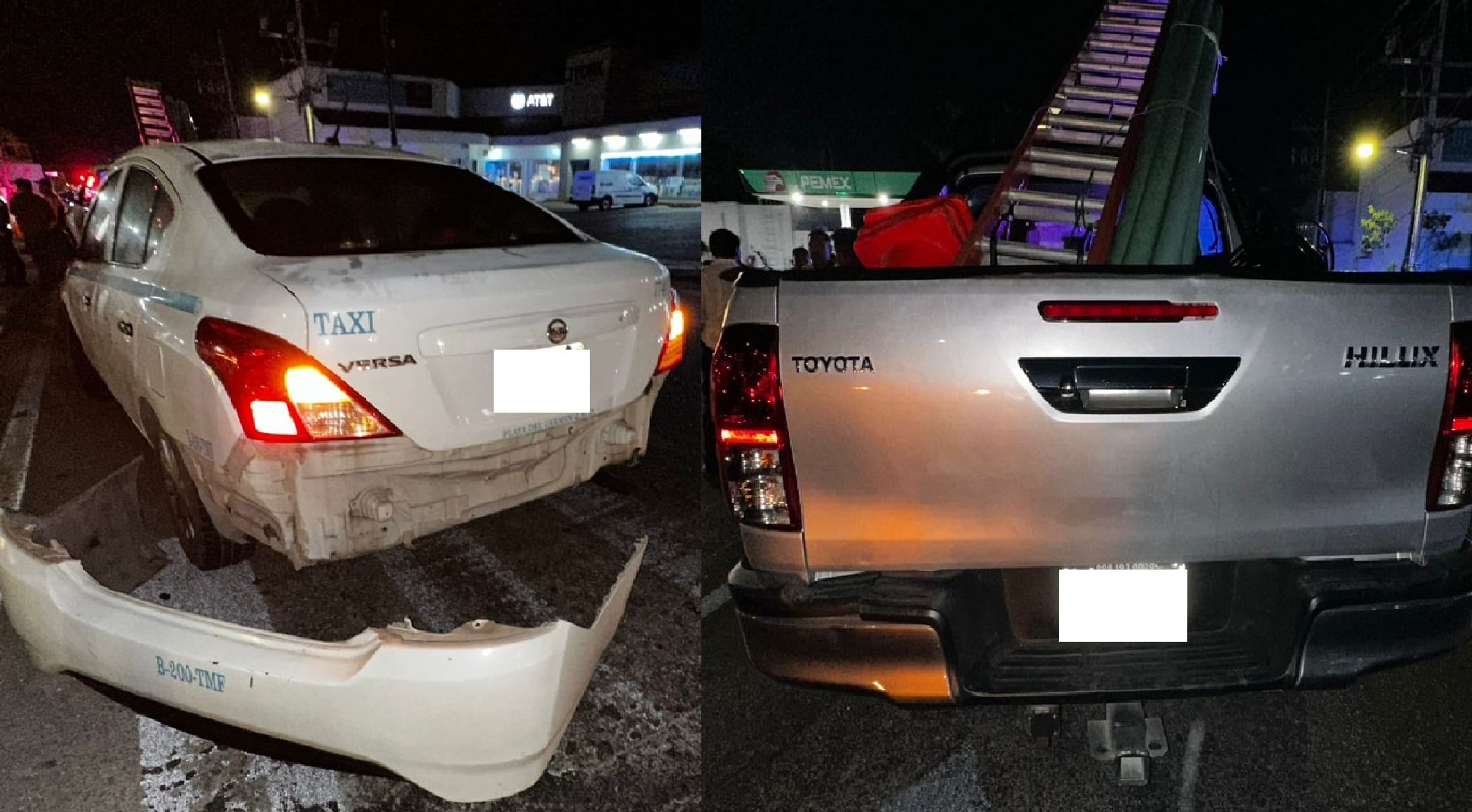 Según la información entregada, el conductor del taxi con el número económico 774 intentó adelantar para ganar el paso a la camioneta que terminó con colisión entre ambos vehículos al invadir el carril contrario, resultando con el taxi destrozado en su parte trasera. Además se informó que aparentemente los tripulantes de la camioneta circulaban en estado de ebriedad.