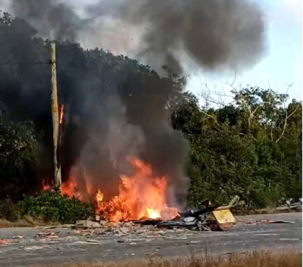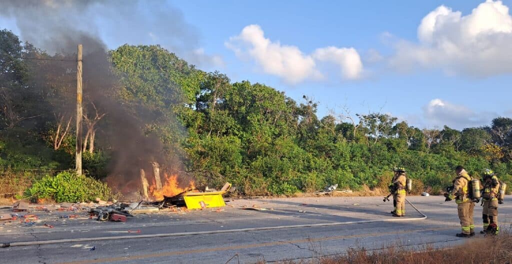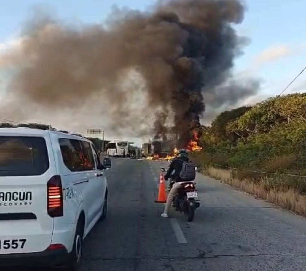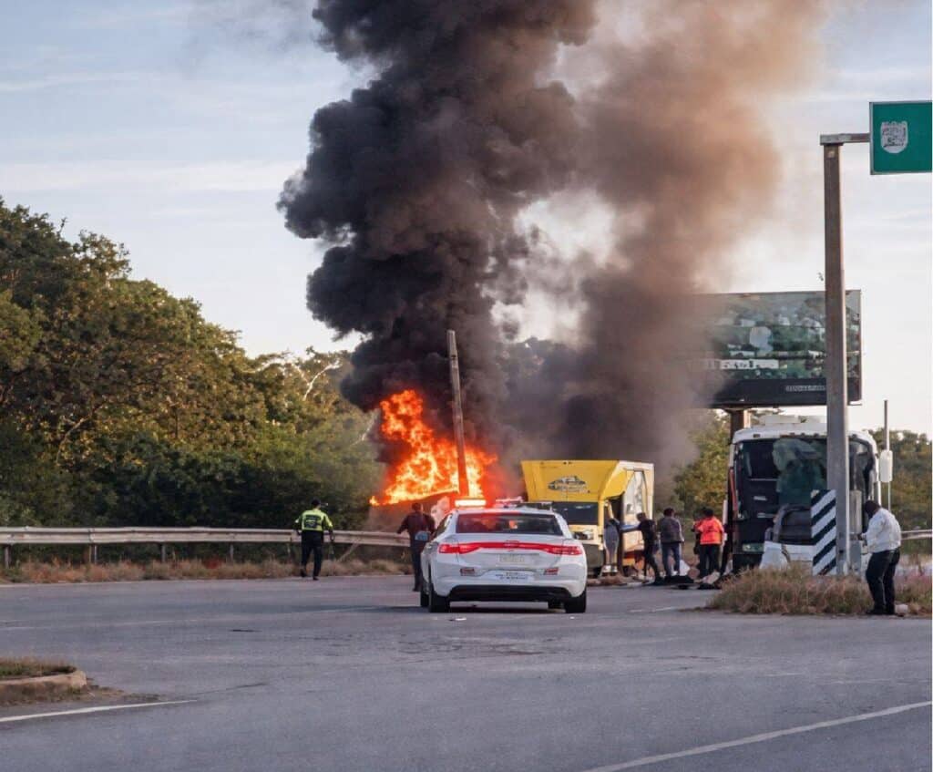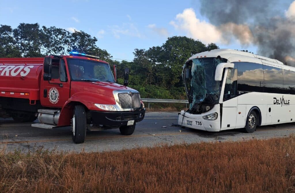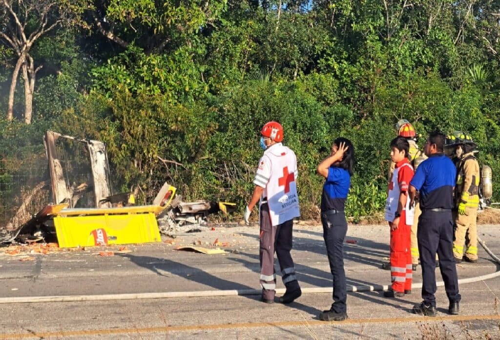 De manera preliminar, se informó que el autobús que transportaba trabajadores hacia centros de hospedaje del corredor turístico, impactó la unidad de reparto y tras el choque fue proyectada contra un poste ubicado a un costado de la vía federal, provocando la caída de cables eléctricos sobre el vehículo, lo que presuntamente generó un incendio que lo consumió en su totalidad en cuestión de minutos.
