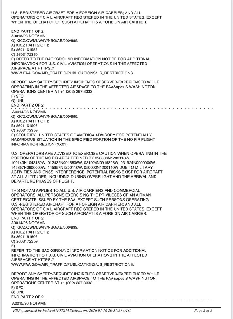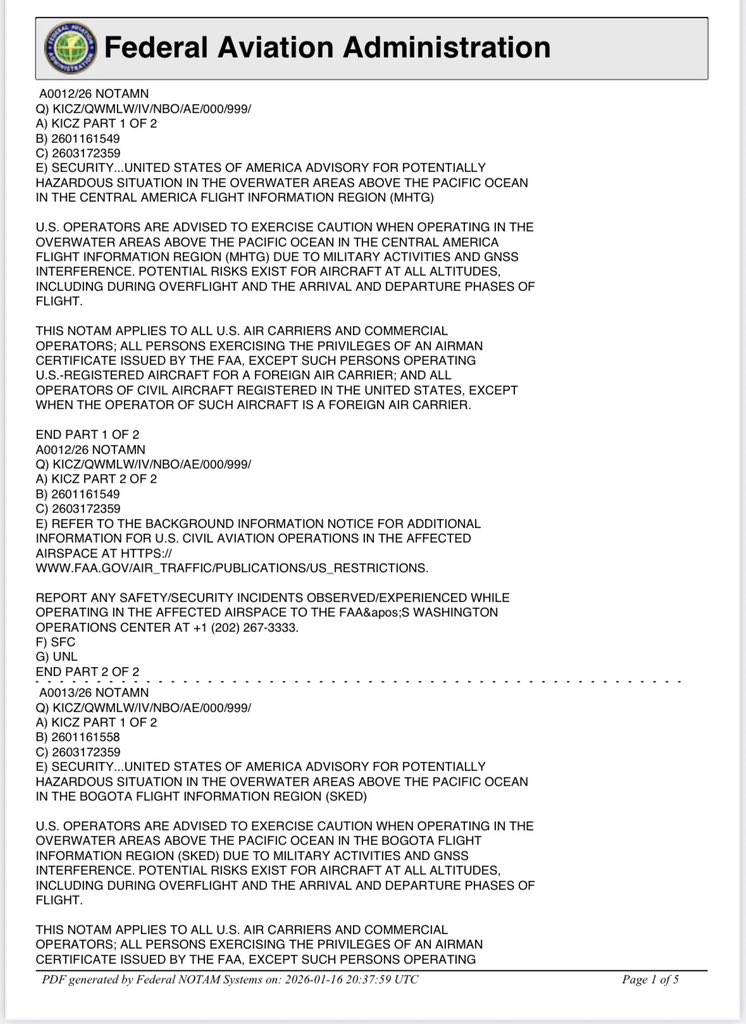 De acuerdo con la FAA, los Avisos a los Aviadores (NOTAM) entraron en vigor el viernes 16 de enero y permanecerán activos durante 60 días, es decir, hasta el 17 de marzo. Las alertas abarcan regiones aéreas de México, países de Centroamérica, Panamá, así como Ecuador, Colombia y amplias zonas del Océano Pacífico oriental.