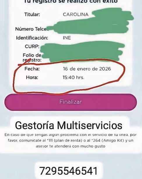 En este contexto, se puede apreciar que para atraer compradores el anuncio en la red social se colocó una imagen de un supuesto registro exitoso de línea telefónica fechado el pasado 16 de enero, en el que se ve que presuntamente se usaron datos personales reales, como nombre, apellidos, una credencial del INE, número de la CURP, así como el número telefónico.