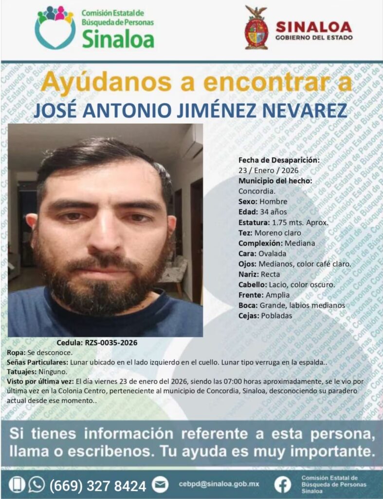 - José Antonio Jiménez Nevarez, hombre de 34 años que fungía como coordinador operativo de seguridad, con estatura aproximada de 1.75 metros y complexión mediana.