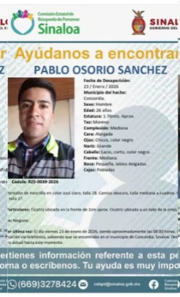 - Pablo Osorio Sánchez, de 26 años, con estatura de 1.76 metros aproximadamente y complexión mediana, también fue reportado como desaparecido el 23 de enero.