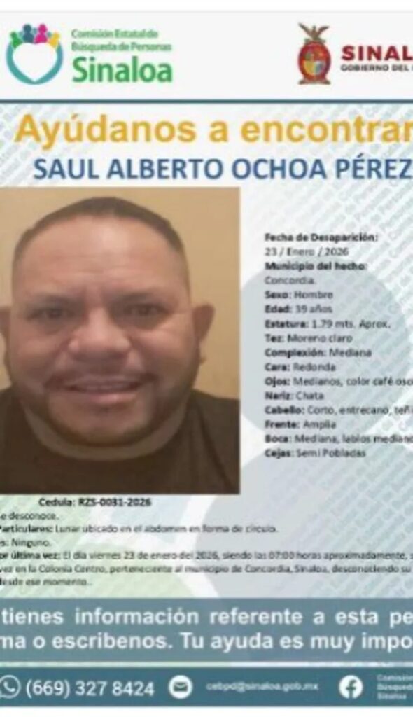 - Saúl Alberto Ochoa Pérez, de 39 años, es uno de los hombres implicados. Es originario de Lázaro Cárdenas, municipio de Meoqui, Chihuahua, con 1.79 metros de estatura aproximadamente. Fue reportado como desaparecido el 23 de enero de este año.