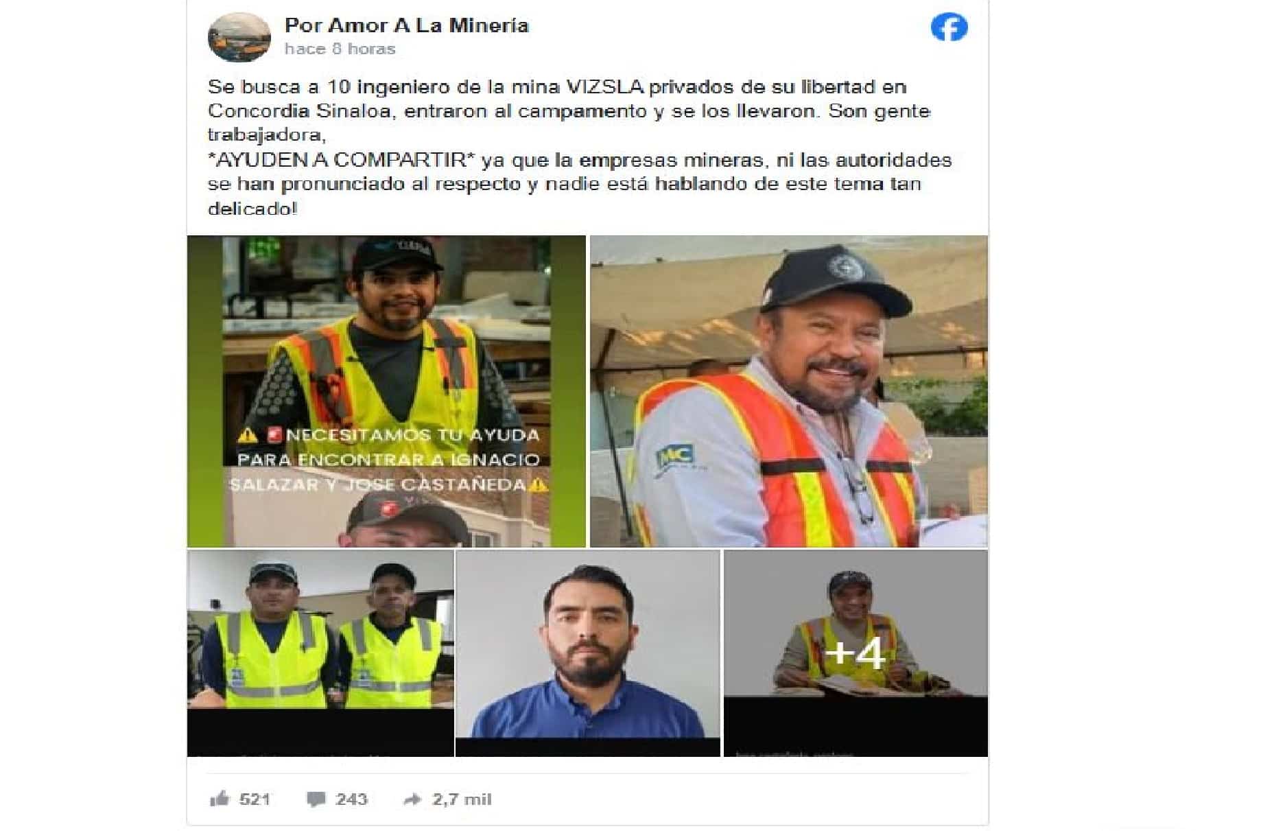 En la zona serrana del municipio de Concordia, fue reportada la desaparición de diez trabajadores de la mina Vizsla Silver Corp, entre ellos los ingenieros Antonio “N”, con cargo de supervisor del medio ambiente, Antonio Esparza, gerente de relaciones comunitarias y José Castañeda.