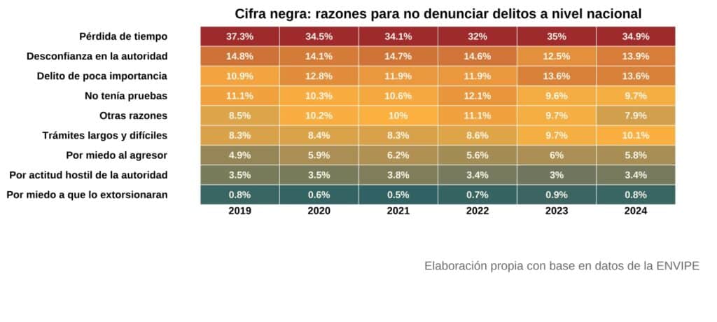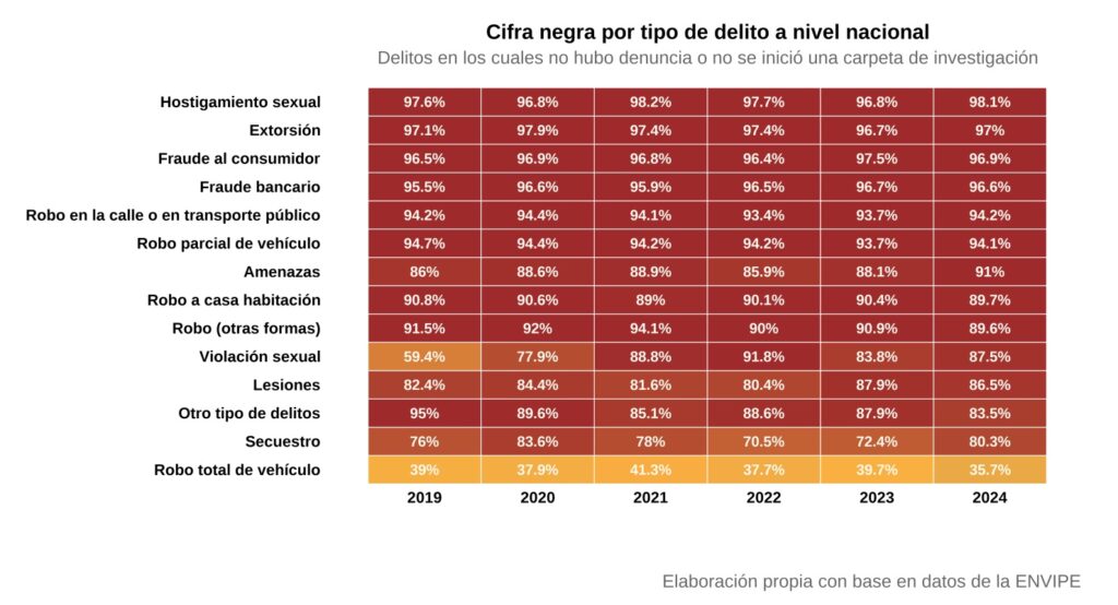 Durante el 2024, sólo 9.6% de los delitos cometidos en México fueron denunciados, de acuerdo con la Encuesta Nacional de Victimización y Percepción sobre Seguridad Pública (ENVIPE) 2025 del Inegi. Esto significa que más del 93% de los casos nunca se investigó, lo que se conoce como cifra oculta; es decir, 9 de cada 10 delitos quedan sin denuncia.