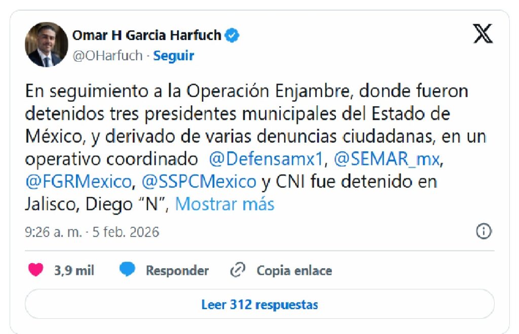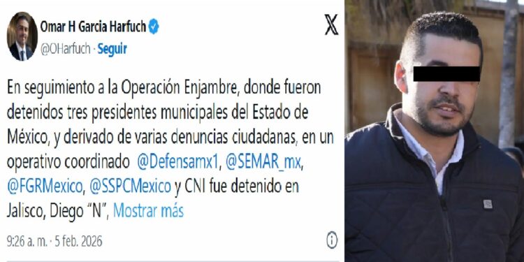 “En seguimiento a la Operación Enjambre, donde fueron detenidos tres presidentes municipales del Estado de México, y derivado de varias denuncias ciudadanas, en un operativo coordinado @Defensamx1, @SEMAR_mx, @FGRMexico, @SSPCMexico y CNI fue detenido en Jalisco, Diego “N”, presidente municipal de Tequila, Jalisco”.