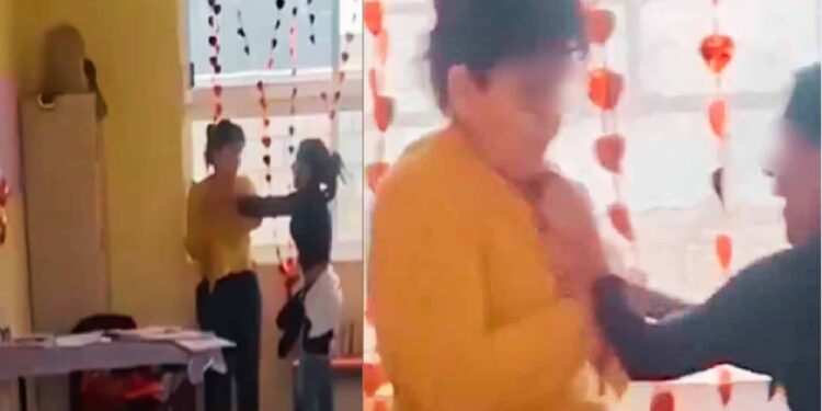 En las imágenes se puede ver como la madre de familia confrontó y agredió físicamente a la docente Karen R. tras revelarse presuntos actos de maltrato infantil contra pequeñitos de tan solo tres años.