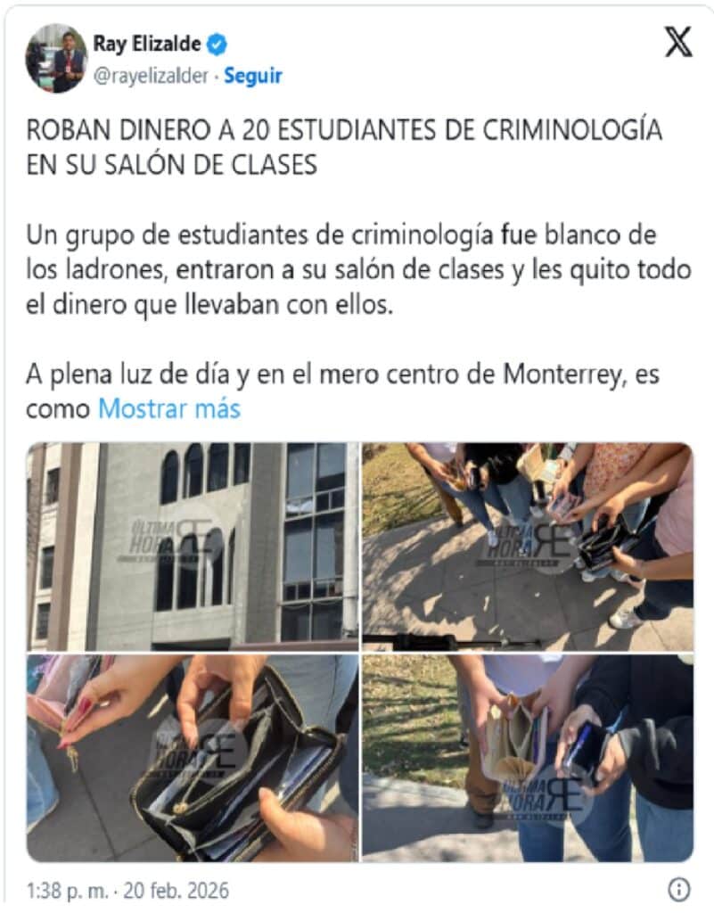 La noticia fue dada a conocer por el periodista Ray Elizalde, de N+ Monterrey, quien señaló que el número de afectados superó la veintena, lo que convierte el hecho en un asalto masivo al interior de una institución educativa, que en teoría debería tener los protocolos mínimos de seguridad.