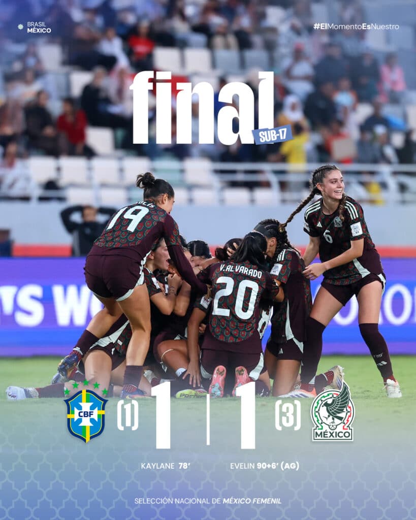 La selección de México Femenina se impuso a Brasil en tanda de penales para conquistar el tercer lugar en el Mundial femenil Sub-17, duelo que se jugó en el Estadio Olímpico de Rabat. En tiempo regular finalizaron 1-1 y en la definición, el Tricolor ganó 3-1, donde Valentina Murrieta detuvo dos disparos.