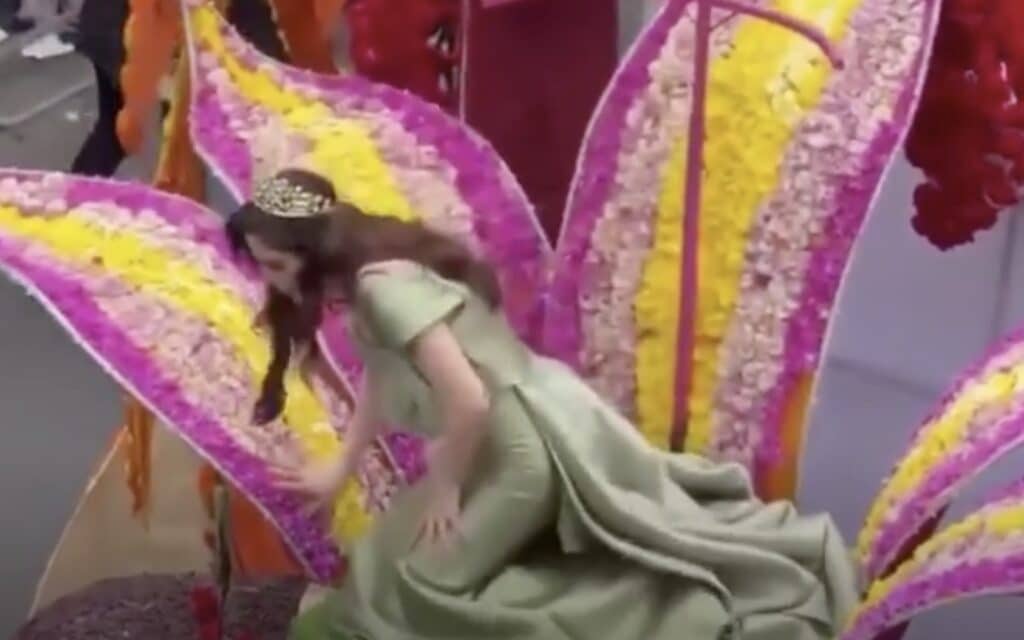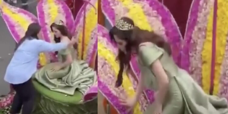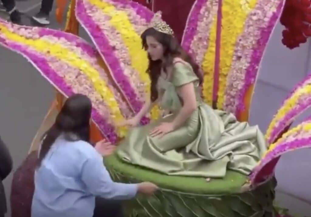 Fue a través de redes sociales que comenzó a circular un video en el que se observa el instante en el que Fátima, quien lucía un espectacular traje de gala verde y saludaba con una sonrisa a su público, comienza a tambalearse hasta perder el conocimiento por unos instantes mientras iba sobre un carro alegórico.