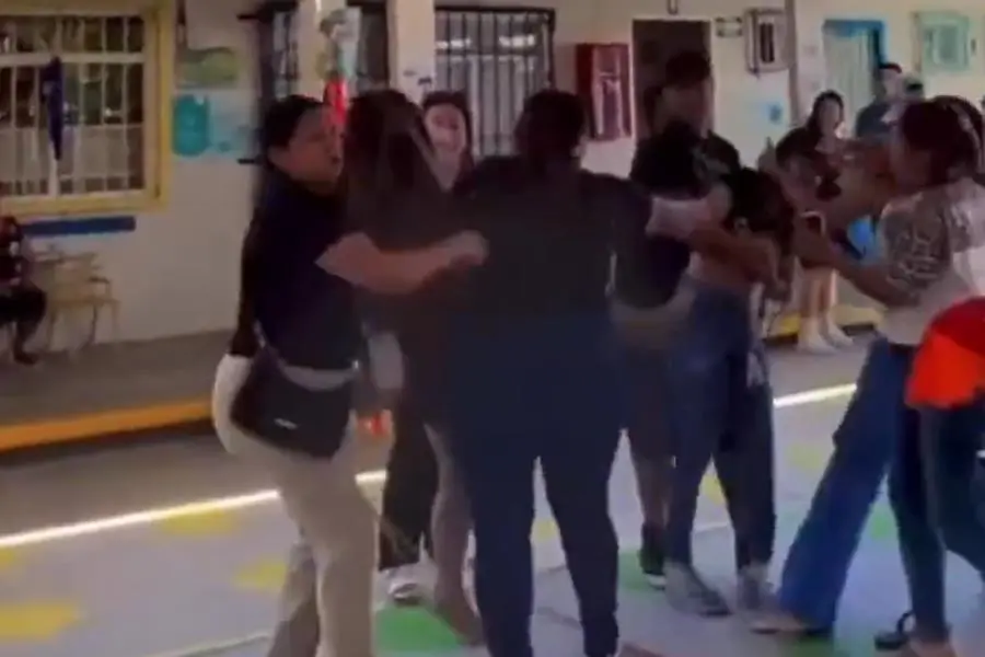 La violenta escena ocurrió en el kínder “24 de Febrero TV”. Hasta el momento, se desconoce el motivo que originó la disputa. En las imágenes destaca el contraste de los niños disfrazados, quienes observaban sorprendidos la gresca mientras esperaban participar en su festival.