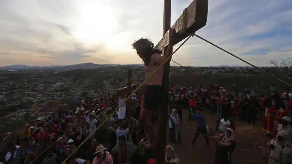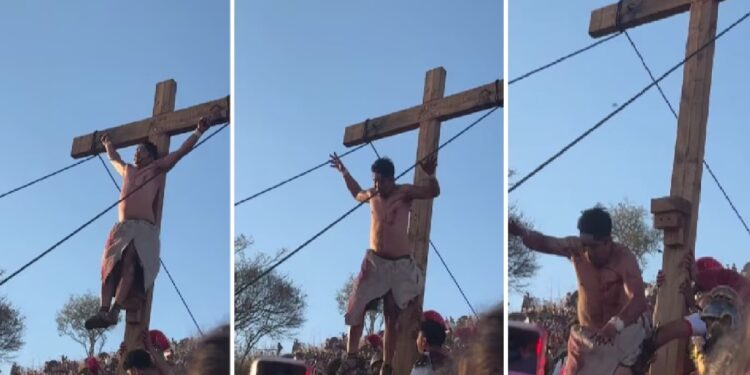 Durante la escenificación de la Pasión de Cristo en San Martín de las Flores, en Tlaquepaque, Jalisco se registró un incidente inesperado cuando el joven que daba vida a Jesús sufrió una caída mientras participaba en uno de los momentos más emblemáticos del acto religioso, cuando se realizaban las maniobras para levantar la cruz.