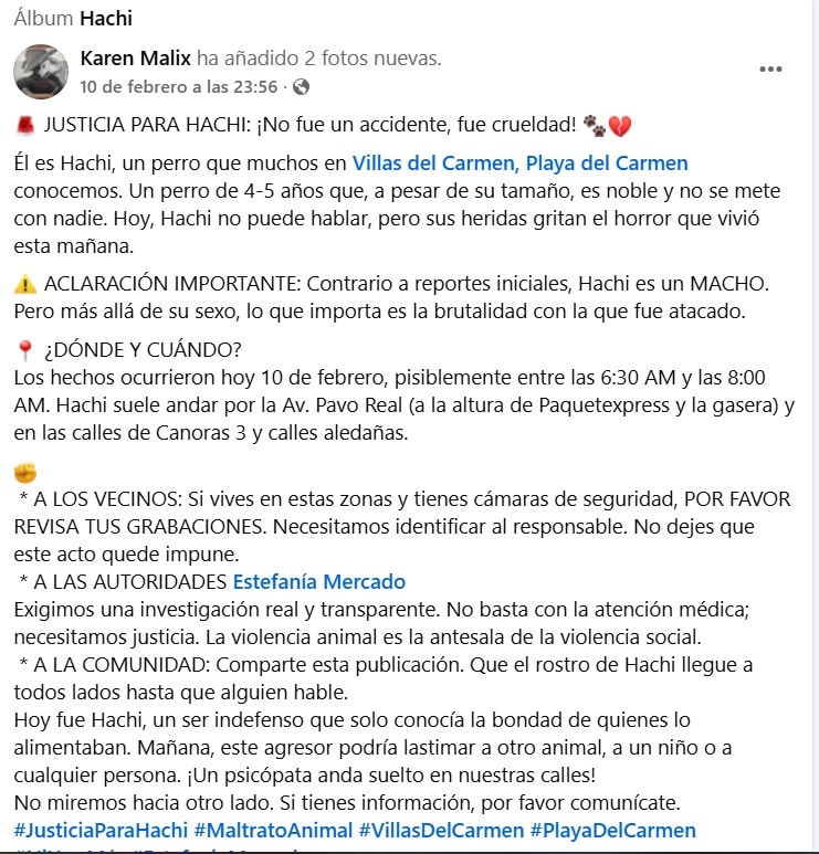 La comunidad advierte que este tipo de violencia no debe minimizarse y exige una investigación transparente. Mientras tanto, Hachi recibe atención médica veterinaria y el caso se ha convertido en un llamado colectivo para reforzar la denuncia y la protección de los animales en Playa del Carmen.