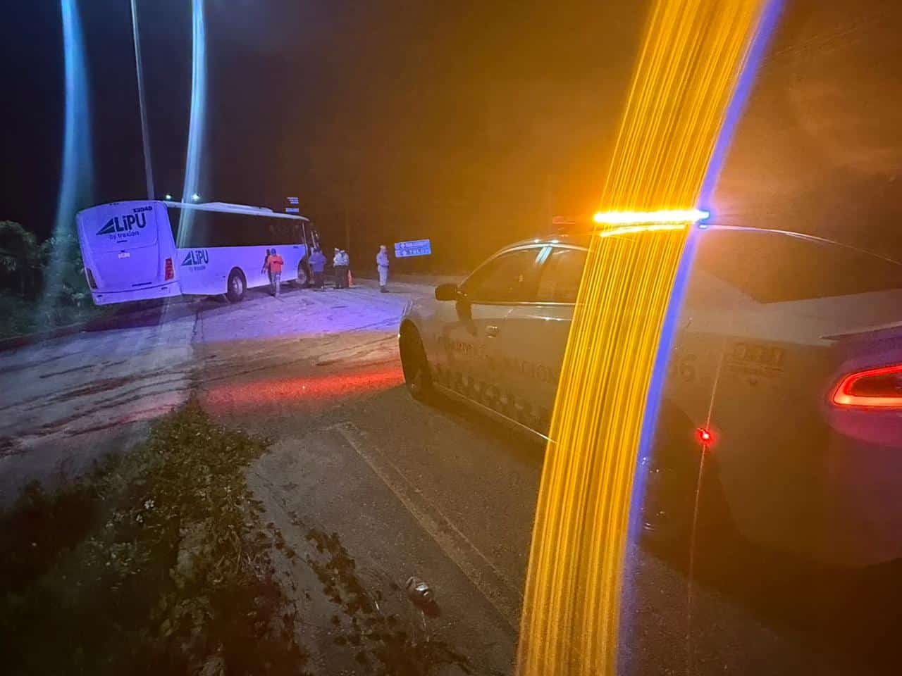 La madrugada de este sábado se registró un incidente vial sobre la carretera federal 307, a la altura del Hotel Nickelodeon, donde un autobús de transporte de personal de la empresa LIPU (unidad 13545) terminó atascado en el camellón central tras intentar dar vuelta en “U”.