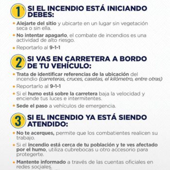 Además, se recomienda que en caso de un incendio forestal, lo principal que se debe hacer es alejarse hacia un lugar sin vegetación, y sobre todo no intentar apagarlo. “Si vas en tu vehículo, identifica la ubicación, ante la presencia de humo baja la velocidad, no te acerques, mantente informado y reportarlo al 911”.