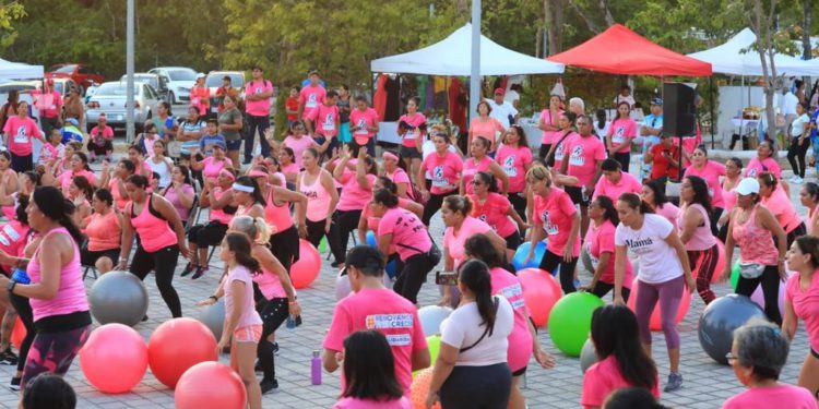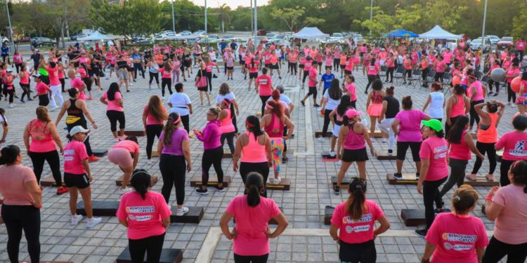 En esta ocasión la actividad física combinó el baile fitness con el ejercicio funcional, donde los asistentes y maestros recibieron sus playeras rosas alusivas al evento con una asistencia de alrededor de 400 personas que se dieron cita.