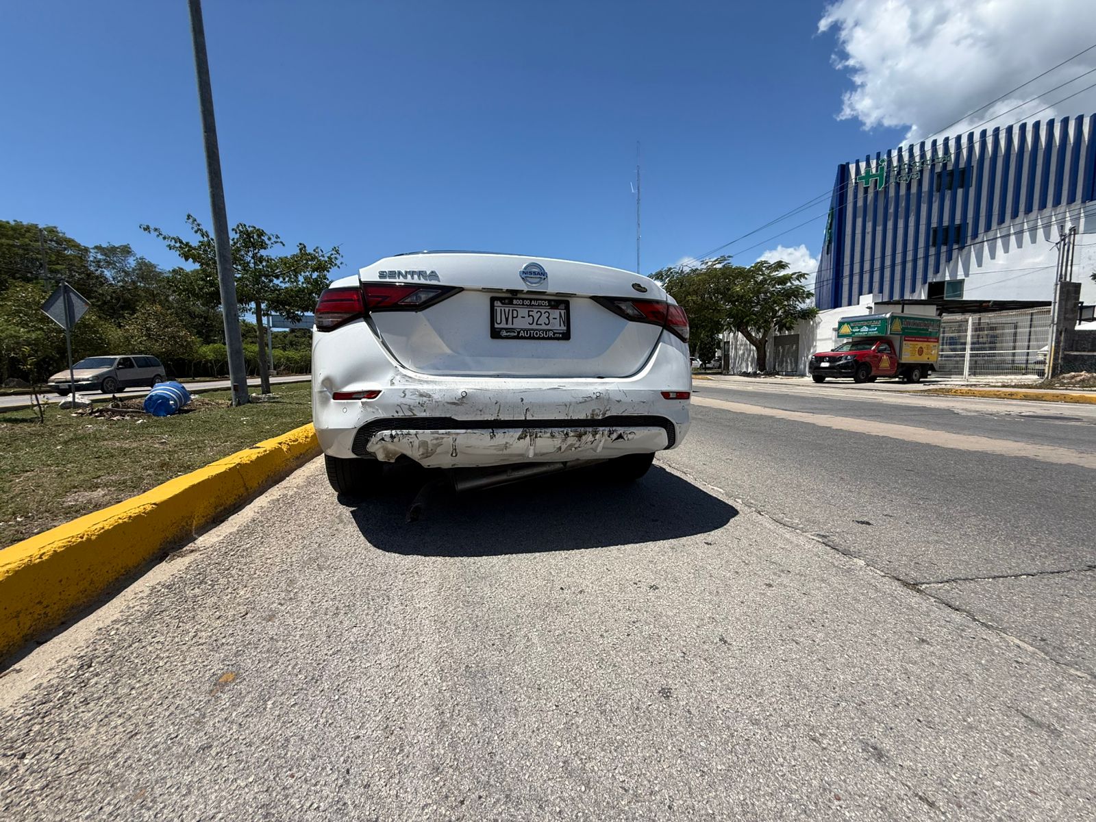 En tanto, el Nissan Sentra presentó afectaciones importantes en la fascia trasera, daños en los sensores de proximidad y el desprendimiento total del mofle.