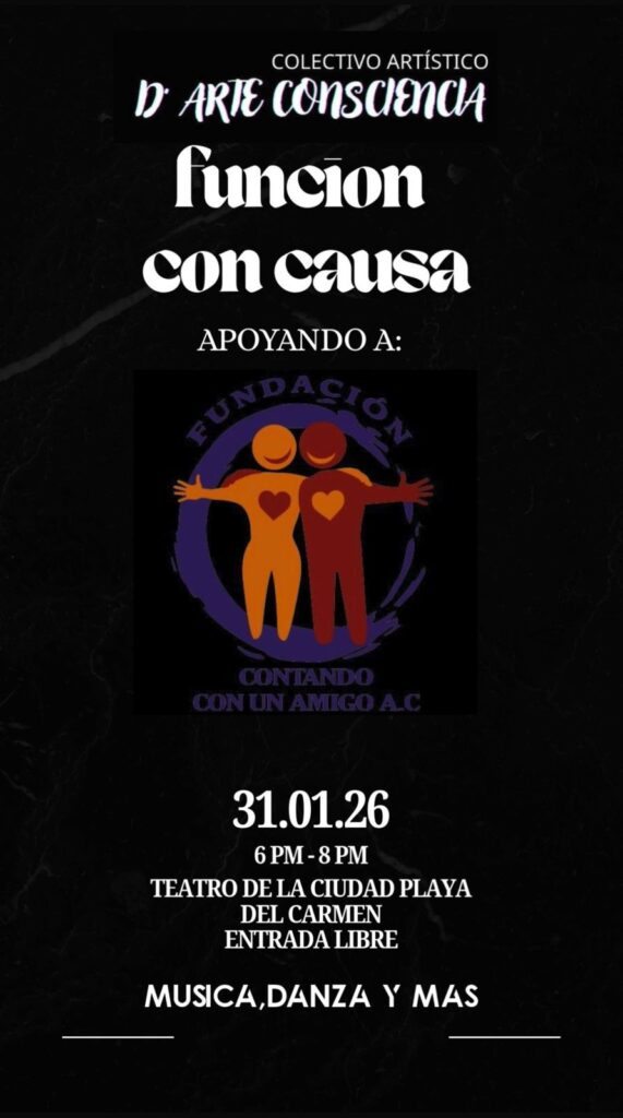 Con el objetivo de apoyar a los sectores más vulnerables de Playa del Carmen, el colectivo artístico D’Arte Conciencia ofrecerá una función totalmente gratuita el próximo sábado 31 de enero, a partir de las 18:00 horas, en el Teatro de la Ciudad.