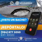 Con la finalidad de que la ciudadanía en general colabore reportando fallas en el equipamiento urbano dañado por el uso y paso del tiempo, que afectan su desplazamiento o entorno, el gobierno encabezado por Lili Campos, a través de la Secretaría de Servicios Públicos Municipales los invita a reportar cualquier anomalía al teléfono 984 877 3050 extensión 100 20.