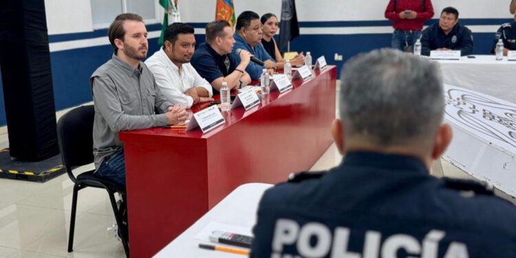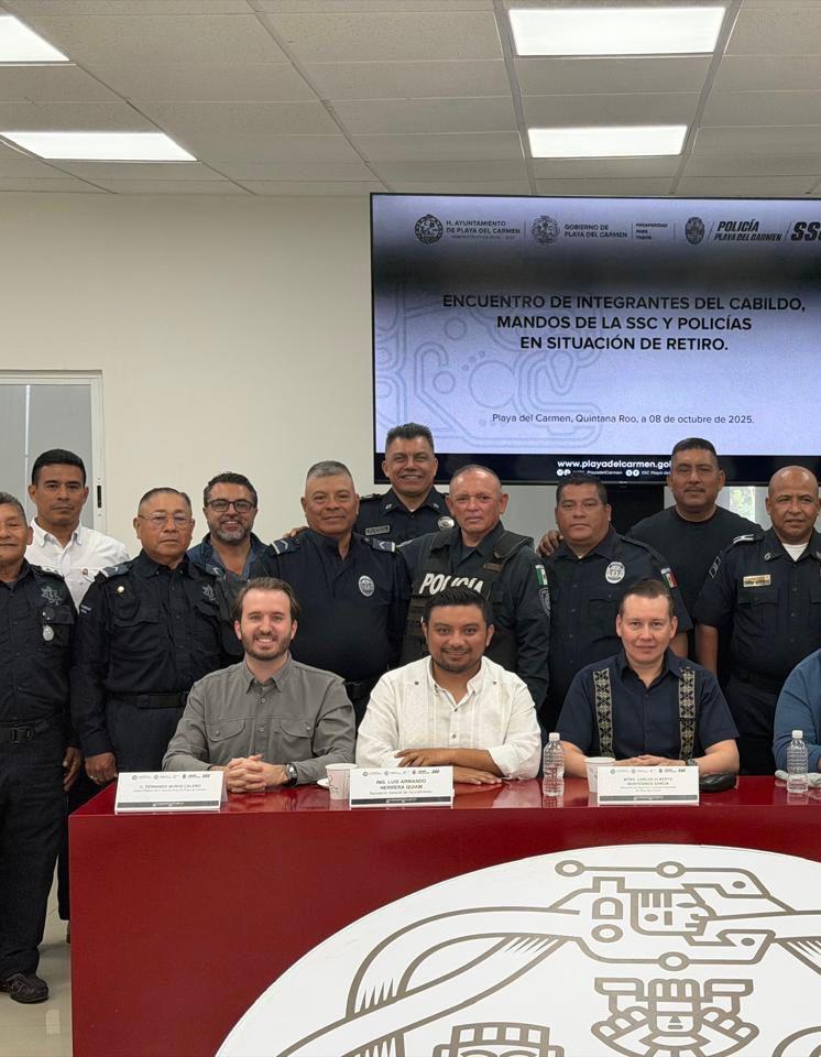 El regidor del Ayuntamiento y coordinador del Partido Verde en Playa del Carmen, Fernando Muñoz Calero, participó en una reunión de trabajo entre el Cabildo y la Secretaría de Seguridad Ciudadana Municipal, encabezada por el secretario General, Luis Armando Herrera Quiam, y el titular de seguridad en el municipio, Carlos Montesinos García, en la que se reconoció la trayectoria, entrega y compromiso de las y los policías que culminan su servicio tras 25 años de labor.