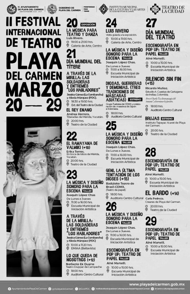 La cartelera oficial del Festival se puede consultar en las redes sociales del Instituto Municipal de la Cultura y las Artes de Playa del Carmen.
