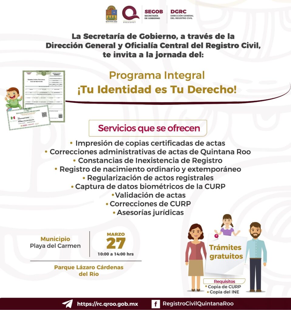 La directora del Registro Civil de Playa del Carmen, Luz Marinelly Carrillo Reyna, informó que el próximo 27 de marzo se llevará a cabo en Playa del Carmen gracias al respaldo del gobierno de Estefanía Mercado, la jornada del programa estatal “Tu identidad es tu derecho”, impulsado por el Gobierno del Estado, a través de la Secretaría de Gobierno, para acercar a la población servicios gratuitos y trámites registrales.