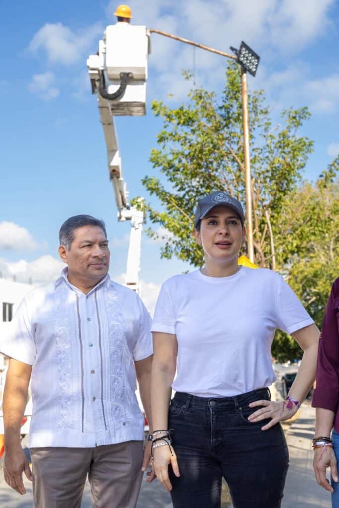 La edil de Playa del Carmen, estuvo acompañada por la secretaria de Servicios Públicos, Julieta Martín Azueta, y el alcalde Gilberto Gómez Martínez, quienes recorrieron la calzada Puerto Maya, donde personal de Alumbrado Público llevó a cabo trabajos de mantenimiento y sustitución de luminarias.