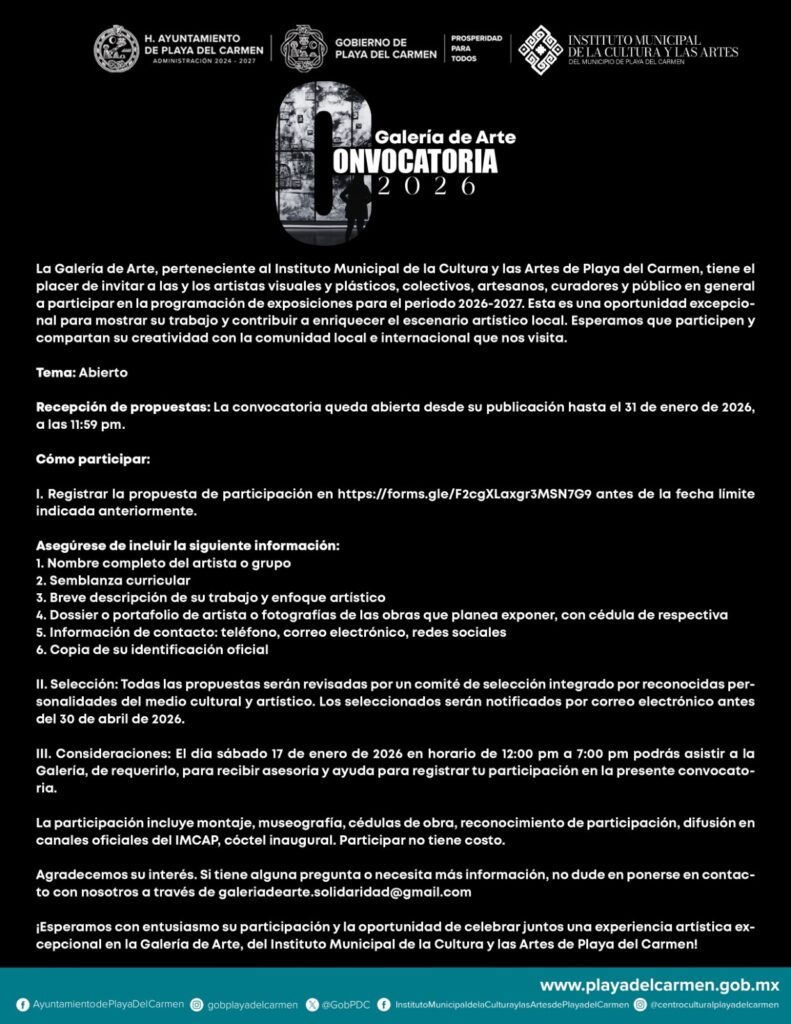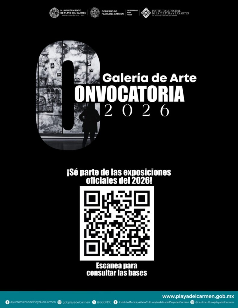 El gobierno de la presidenta municipal Estefanía Mercado, a través del Instituto Municipal de la Cultura y las Artes de Playa del Carmen (IMCAP), lanzó la Convocatoria 2026 dirigida a la comunidad artística local, con el objetivo de integrar nuevas exposiciones en la Galería de Arte del Palacio Municipal, ubicada en la colonia Centro.