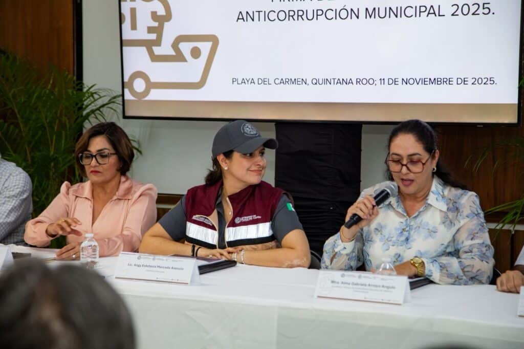 La presidenta municipal Estefanía Mercado, junto con la secretaria técnica de la Secretaría Ejecutiva del Sistema Anticorrupción del Estado de Quintana Roo (Sesaeqroo), Alma Gabriela Arroyo Angulo, firmaron este martes la Estrategia Anticorrupción Municipal 2025, un acuerdo que consolida el compromiso del Ayuntamiento de Playa del Carmen con la transparencia, la rendición de cuentas y la integridad en el servicio público.