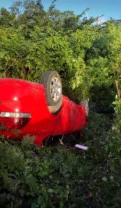 El vehículo se precipitó fuera de la vía de rodamiento, cayendo en un área de maleza que se encuentra a un costado de la carretera, donde dio volteretas hasta quedar con las cuatro llantas hacia arriba.
