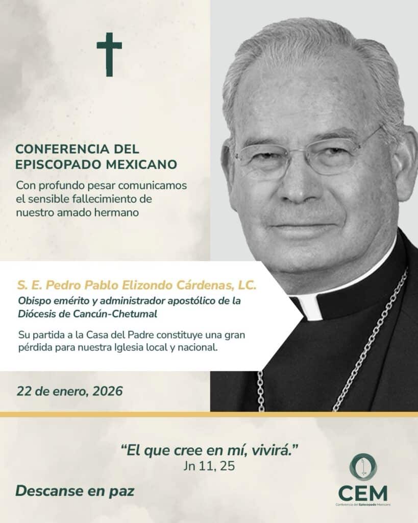 La Diócesis de Cancún-Chetumal informó el fallecimiento de Monseñor Pedro Pablo Elizondo Cárdenas, primer Obispo de esta jurisdicción eclesiástica, ocurrido presuntamente durante una intervención quirúrgica del corazón. Su muerte ha generado una amplia expresión de condolencias entre la comunidad católica, líderes sociales y actores políticos de Quintana Roo y del país. La noticia la dio a conocer la misma Diócesis a través de redes sociales.