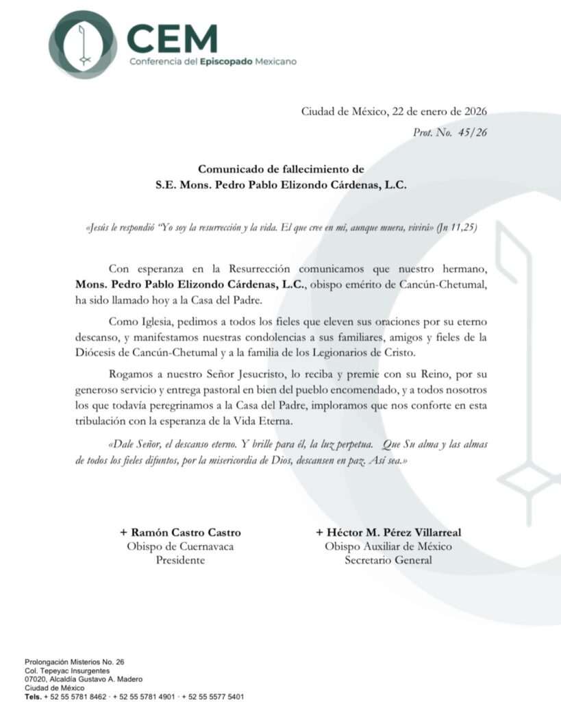 “Como Iglesia, pedimos a todos los fieles que eleven sus oraciones por su eterno descanso, y manifestamos nuestras condolencias a sus familiares, amigos y fieles de la Diócesis de Cancún-Chetumal y a la familia de los Legionarios de Cristo“.
