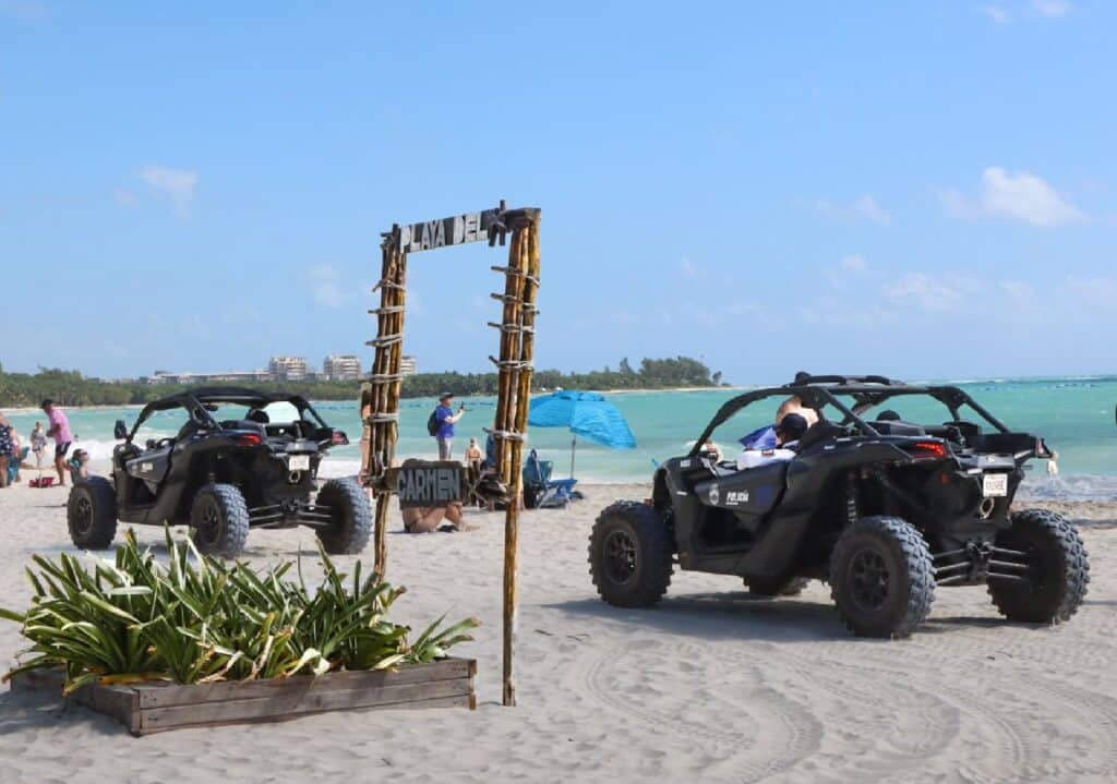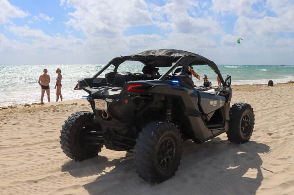 Mediante patrullajes y recorridos que se realizan durante el día en playas públicas, incluidas las certificadas, la SSCM previene el delito y garantiza la seguridad de bañistas, mientras que la Policía Turística, con apoyo de la Unidad K-9, mantiene vigilancia continua en accesos y arenales, y utiliza unidades tipo Razers para ampliar la cobertura de los recorridos en toda la franja costera.