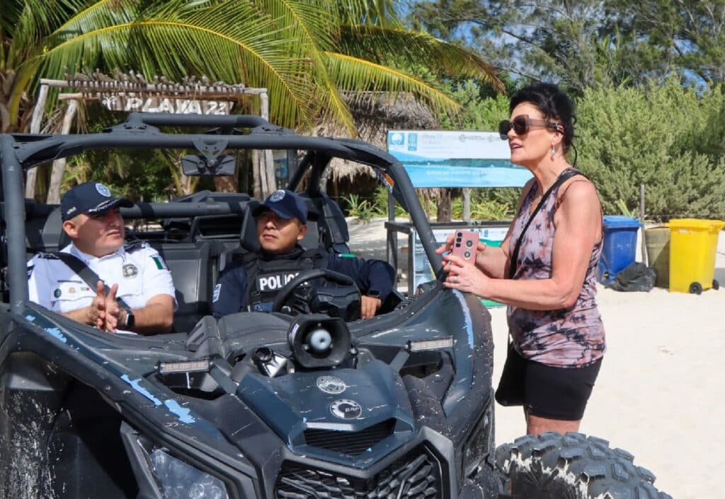 La presidenta municipal Estefanía Mercado a cargo del Gobierno de Playa del Carmen por medio de la Secretaría de Seguridad Ciudadana (SSCM), mantiene presencia permanente en la franja costera del municipio para reforzar la prevención del delito y brindar atención directa a familias, visitantes y trabajadores del sector turístico.