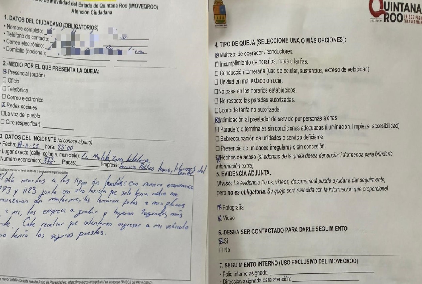 Ante este hecho el conductor Indriver (cuya identidad es reservada) presentó ayer miércoles 19 de noviembre una denuncia formal ante el Instituto de Movilidad del Estado de Quintana Roo (IMOVEQROO) donde manifiesta haber sufrido acoso, intimidación y maltrato el martes 18 noviembre por parte de los conductores de los taxis con número económico 723 y 1123.