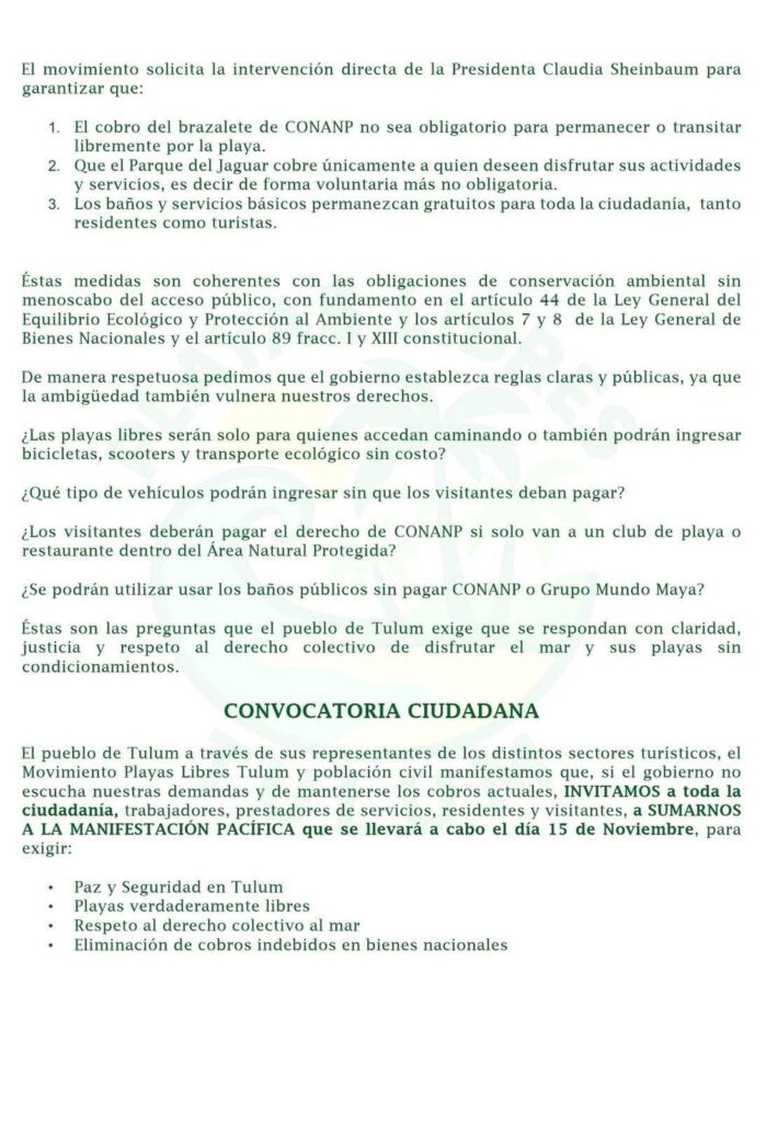 El movimiento solicita la intervención inmediata de la presidenta de la República, Claudia Sheinbaum, para garantizar el acceso libre y gratuito a las playas, así como los siguientes puntos: