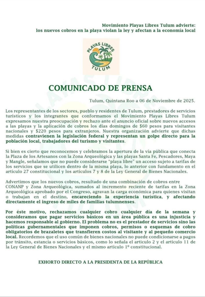 El comunicado se apoya en el Artículo 27 Constitucional y los Artículos 7 y 8 de la Ley General de Bienes Nacionales, que establecen que las playas son bienes de uso común. Además, denuncia que estos cobros se suman a las tarifas de la Zona Arqueológica de Tulum y los cargos impuestos por la CONANP, lo que encarece la experiencia para visitantes y pequeños comercios.