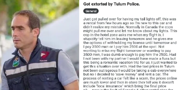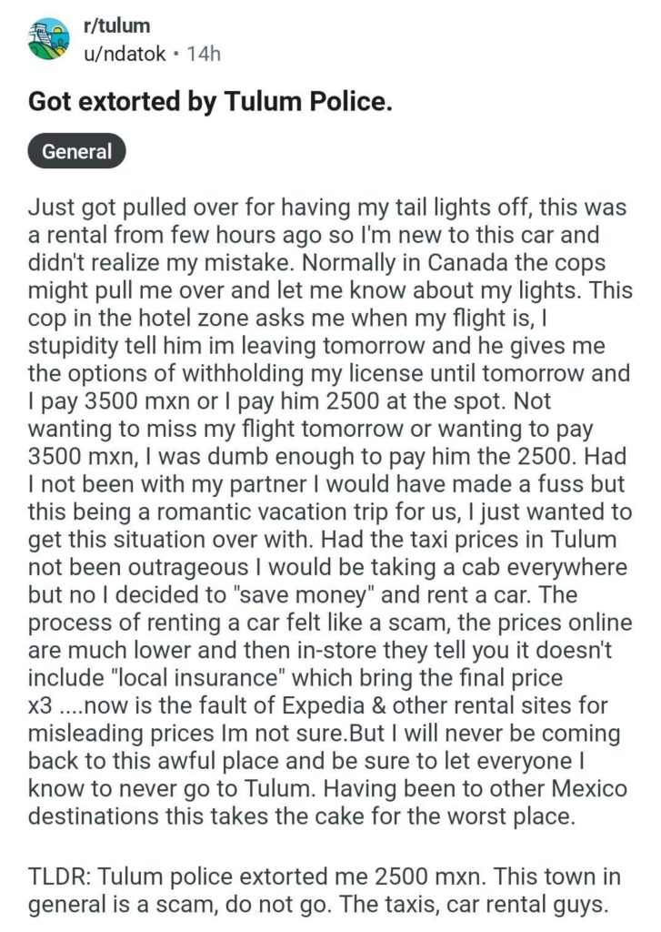 Este relato fue publicado en la plataforma Reddit en donde el usuario “ndatok” relató que decidió rentar un automóvil, ya que los altos costos de traslados a bordo de un taxi local son exuberantes. Explica que durante el trayecto en la zona hotelera de la ciudad, el vehículo fue interceptado por los agentes policiacos debido a que traía un foco apagado. De acuerdo a su relato, el turista canadiense mencionó: